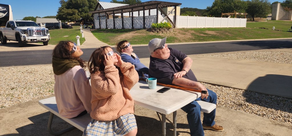 Gary is still in the lead with the MG dance and hasn’t stopped living life to the fullest. We recently went to Kerrville to see the solar eclipse. What an adventure that was! We have decided that any towing of the RV will be done in the morning with completion no later than 2:00. This is with LOTS of breaks. We will also be talking to the pulmonary doctor about getting a nasal pillow mask to wear with his non-invasive ventilator during the day. I suspect he is already making plans to decorate it to match his fancy portable walker! π